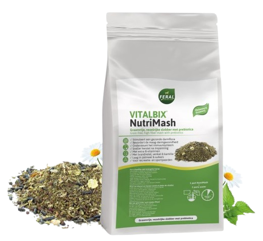Vitalbix NutriMash stimuleert een gezonde darmflora en ondersteunt het immuunsysteem. Bevat extra B-vitaminen, zorgt voor sneller herstel na inspanning en geeft langzaam vrijkomende energie. Een waardevolle aanvulling op het rantsoen van sportpaarden, paarden met verteringsproblemen, bij herstel na ziekte, oudere paarden en paarden met ondergewicht. Bevat een gezonde mix van brandnetel, venkelzaad & kamille ter ondersteuning van de weerstand, de afvoer van afvalstoffen en de spijsvertering.