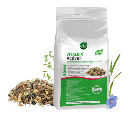 Vitalbix active+ muesli 22 kg een gezonde vezelrijke muesli geschikt voor langdurige, matige en zware arbeid. Deze mueslli geeft extra power in de vorm van beheersbare energie uit vezels (22%) en vetten (8,5%) en is geschikt voor paarden die snel heet worden. Zorgt voor een verminderde productie en een snellere afvoer van melkzuur en voorkomt spierstijfheid.