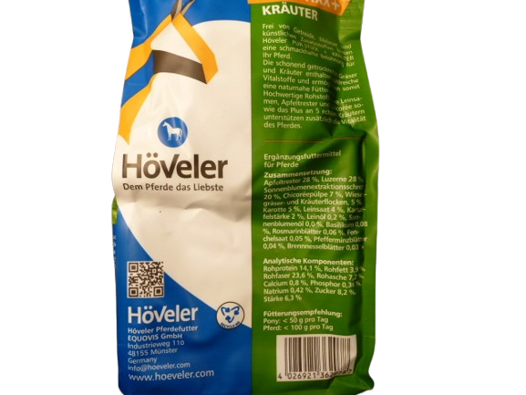 Appelpulp, Luzerne, Zonnebloemschroot, Chicoree, Gras- en Kruiden vlokken, Wortel, Lijnzaad, Lijnzaadolie, Zonnebloemolie, Oregano, Kamille